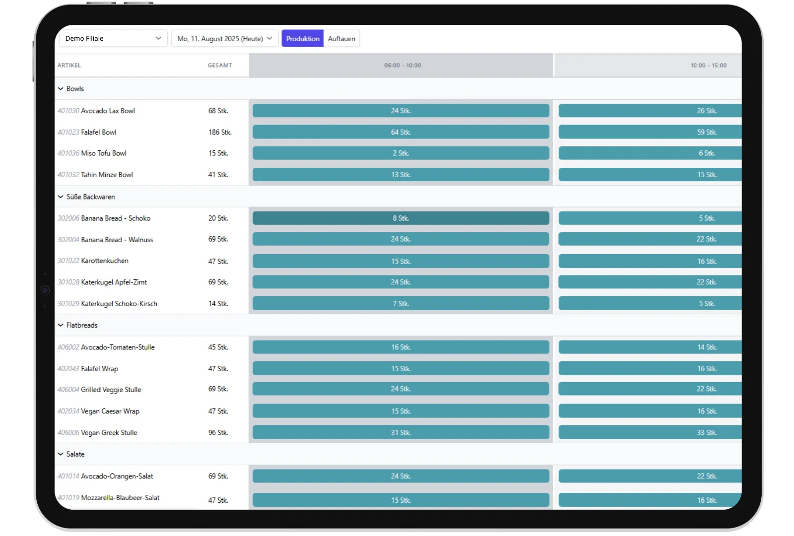 The production plan provides intra-day AI-powered forecasts to ensure optimal product availability throughout the day. By updating predictions multiple times per day, it enables store teams to produce and replenish with precision - right when it matters.