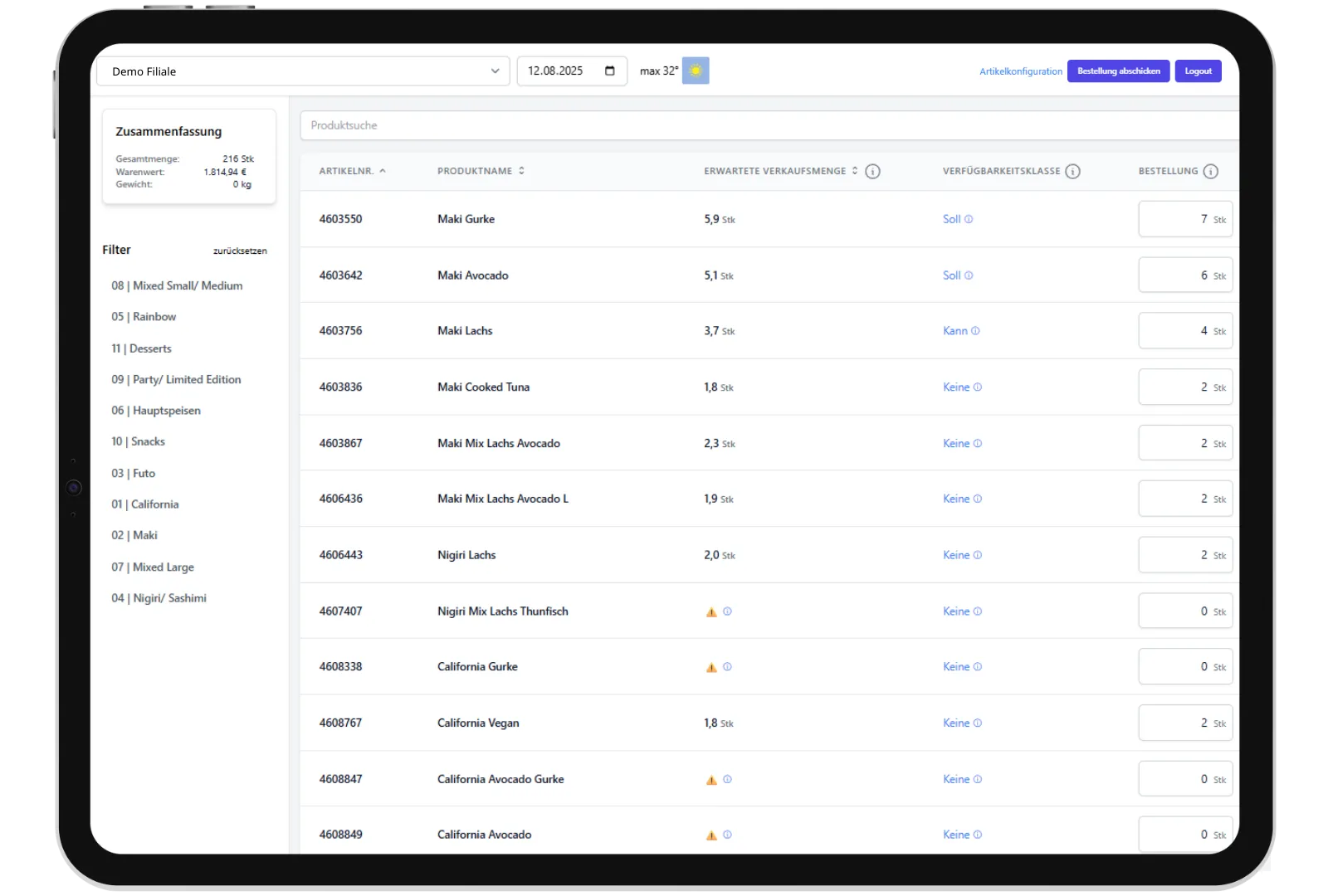 The user interface and functions of our system are intuitive and clearly structured. Even without in-depth IT knowledge, you can easily view, analyze and incorporate the forecast data into your ordering processes. The most important functions are designed in such a way that they can be accessed with just a few clicks, and the evaluation of forecasts is automated. This means that you don't have to deal with the manual calculation of order quantities or complex data analyses.